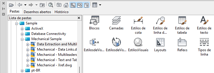 O DesignCenter fornece uma forma de localizar rapidamente o conteúdo, como arquivos de desenho, definições de bloco e hachuras.