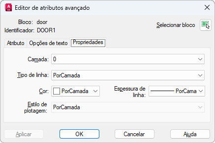 Define a camada que o atributo está e a cor, espessura e tipo de linha do texto do atributo. Se o desenho utilizar os estilos de plotagem, você pode designá-lo ao atributo utilizando a guia Propriedades