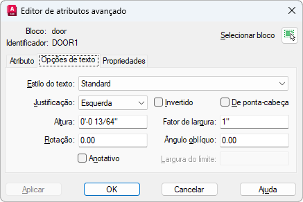 Configura as propriedades que definem a forma como o texto de um atributo é exibido no desenho. Altere a cor do texto do atributo na guia Propriedades.