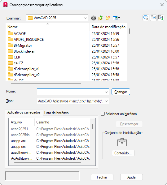 Se você selecionar um arquivo que já tenha sido carregado, Carregar recarregará o aplicativo quando aplicável. Você não poderá recarregar os aplicativos ObjectARX. Nesse caso, será necessário primeiro descarregar o aplicativo ObjectARX e, em seguida, carregá-lo novamente. A opção Carregar estará também disponível em um menu de atalho exibido ao clicar com o botão direito do mouse em um arquivo na guia Lista de histórico.