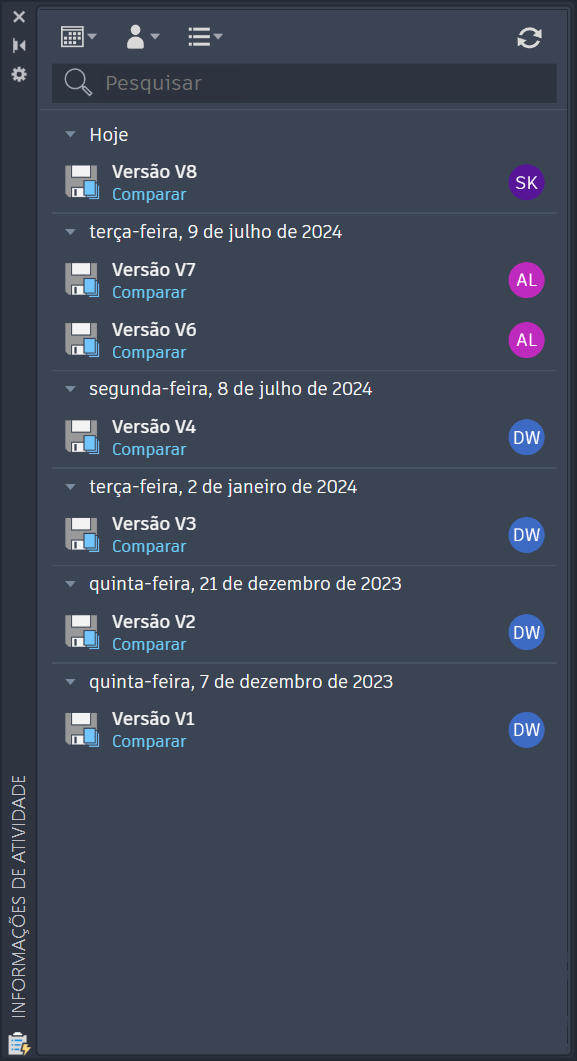 Use Informações de atividade para ver as contribuições de seus colegas de equipe em arquivos de desenho compartilhados, comparar históricos de versões e colaborar entre produtos AutoCAD.