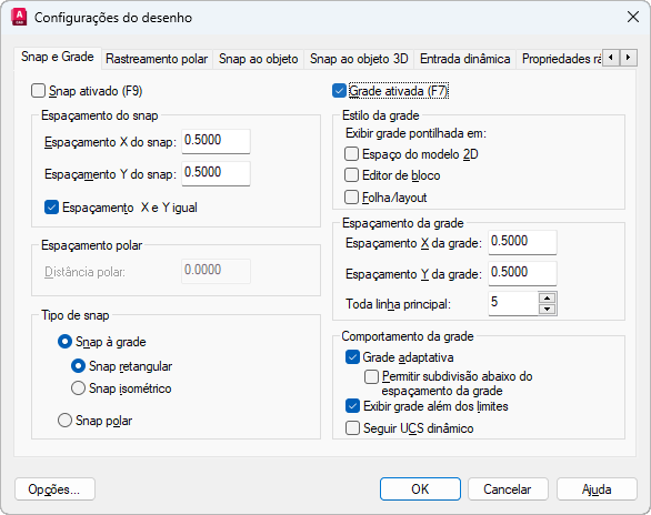 Se esse valor for 0, a distância do PolarSnap assumirá o valor de Espaçamento X do snap. A configuração Distância polar é utilizada juntamente com o rastreamento polar e/ou com o rastreamento de snap a objeto. Se nenhum dos recursos de rastreamento estiver ativado, Distância polar não terá efeito.