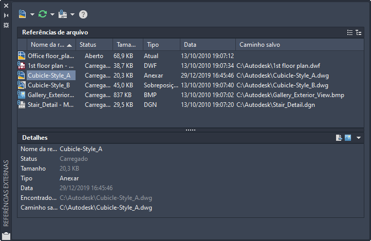 A paleta Referências externas organiza, exibe e gerencia arquivos referenciados, como arquivos DWG (xrefs), DWF, DWFx, PDF ou subjacências DGN, imagens rasterizadas, nuvens de pontos (arquivos RCP e RCS) e modelos de coordenação (arquivos NWD e NWC).