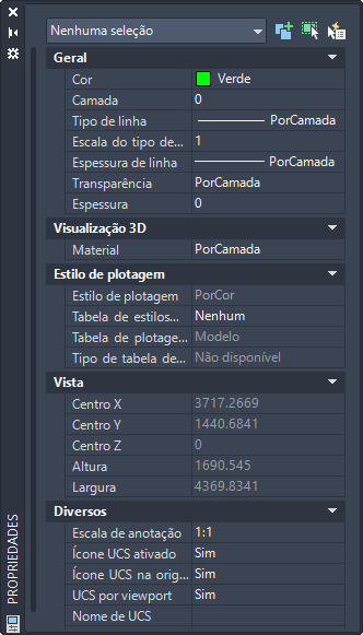 Se nenhum objeto estiver selecionado, as listas suspensas realçadas acima exibirão as configurações atuais para o desenho. Se você selecionar um objeto, as listas suspensas exibirão as configurações de propriedades do objeto.