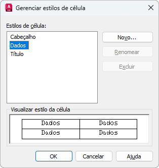 Lista todos os estilos de célula dentro do estilo atual de tabela. Os estilos de célula Título, Cabeçalho e Dados são sempre contidos em qualquer estilo de tabela.