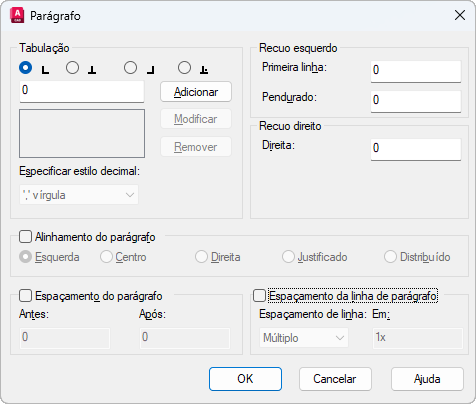 Especifica as paradas de guia, recuos, controles de alinhamento de parágrafo, espaçamento do parágrafo e espaçamento de linha de parágrafo.