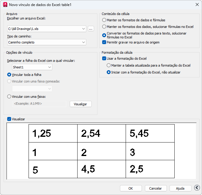 Vincula os dados de uma planilha criada no Microsoft Excel com uma tabela dentro de seu desenho.