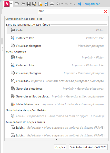 O campo de pesquisa de comando é exibido na parte superior do menu do aplicativo. Os resultados da procura podem incluir comandos de menu, dicas básicas de ferramentas e sequências de texto de prompt de comando. É possível inserir um termo de procura em qualquer idioma. Os resultados são aplicados ao espaço de trabalho atual.