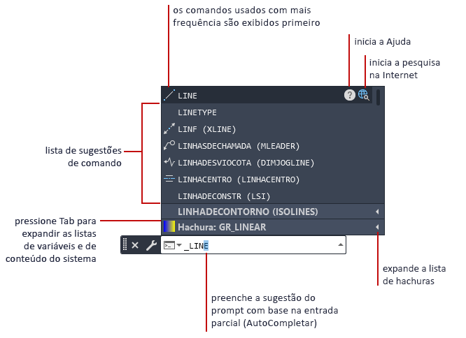 Uma lista dos comandos sugeridos é exibida assim que você insere as primeiras letras de um comando na janela de comando ou na caixa de entrada dinâmica. Por padrão, a lista tem as seguintes características: