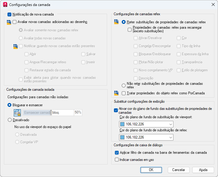 Controla quando ocorre a notificação para novas camadas, o comportamento de camadas quando algumas camadas estão isoladas, se são aplicados filtros à barra de ferramentas Camadas e a cor do plano de fundo das sobreposições de viewport no Gerenciador de propriedades de camada.
