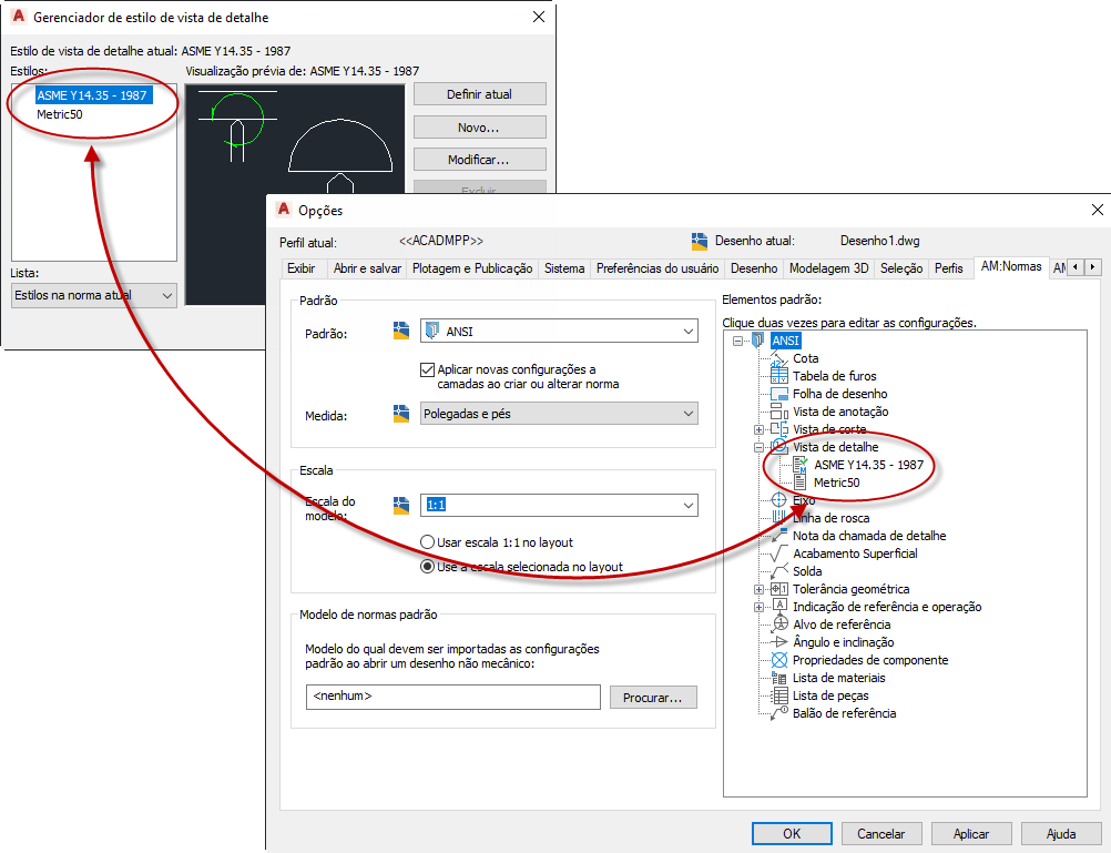 As configurações que controlam a aparência de objetos do conjunto de ferramentas do AutoCAD Mechanical são salvas em um grupo de configurações de nome norma de desenho. Sendo assim, a forma na qual os estilos de vista de detalhe são aplicados aos objetos do AutoCAD (vistas de detalhe da documentação do modelo) é diferente da forma como são aplicados aos objetos do conjunto de ferramentas do AutoCAD Mechanical (vistas de detalhe criadas com o comando AMDETAIL). Consequentemente;