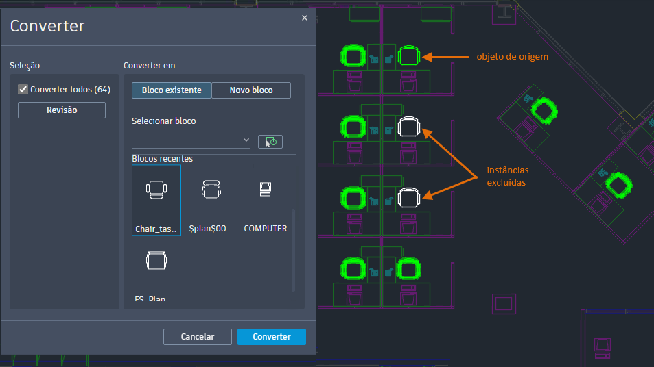 Conversão de blocos: o comando CONVERTERBLOCO agora aproxima o zoom nos objetos selecionados. A caixa de diálogo Converter também inclui a opção para atribuir blocos a camadas. Além disso, a nova variável de sistema BCONVERTINCLUDEEXISTINGBLOCKS determina se as instâncias de bloco existentes são selecionadas pelo comando CONVERTERBLOCO por padrão.