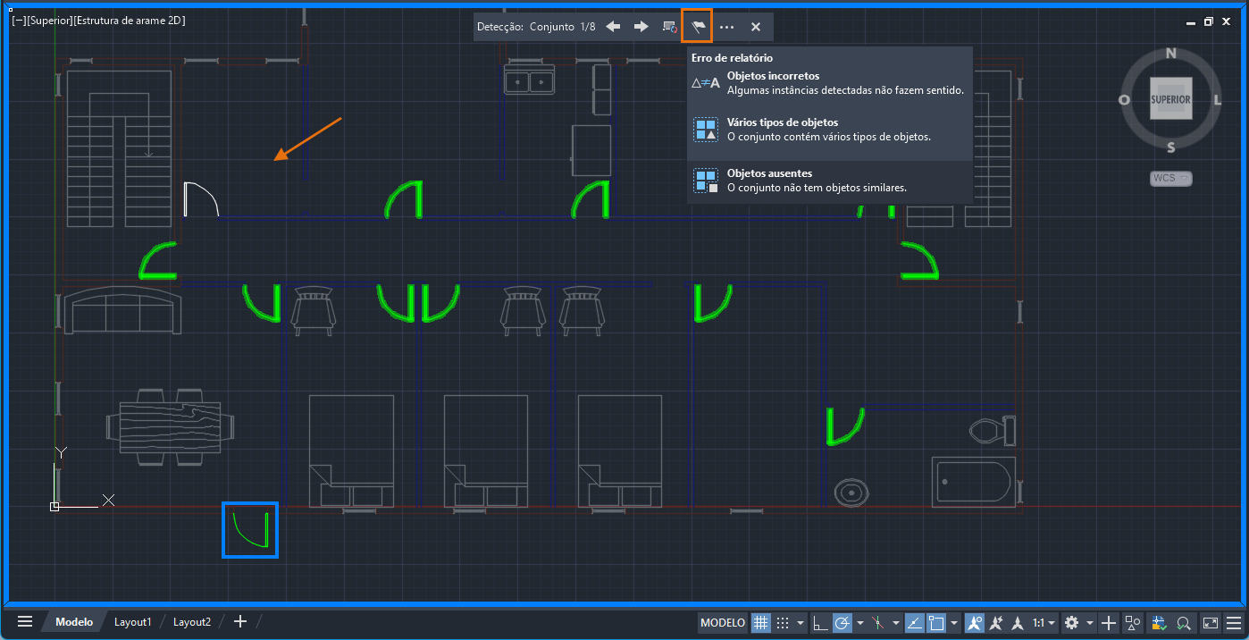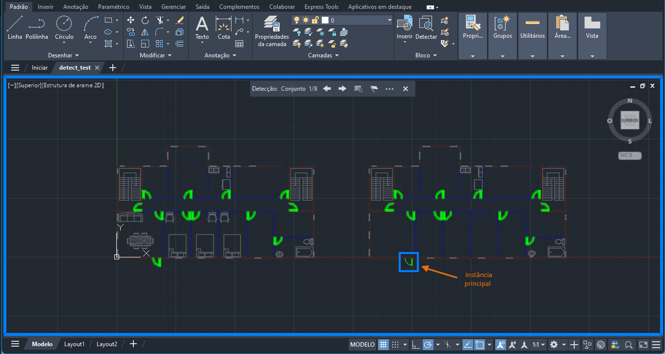 No modo de revisão, a barra de ferramentas Detecção é exibida na parte superior da janela de desenho. Essa barra de ferramentas fornece várias opções para navegar e gerenciar os resultados da detecção. Os resultados da detecção são agrupados em conjuntos de objetos similares. Um conjunto representa um grupo de objetos similares detectados que podem ser convertidos em instâncias de um único bloco.