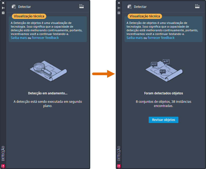 Quando você inicia a Detecção de objeto, a geometria do desenho é enviada para o serviço de aprendizado de máquina do AutoCAD para reconhecimento. Após o serviço ter analisado o desenho, a paleta notificará você se algum objeto que pode ser convertido em bloco tiver sido convertido. Para inspecionar e avaliar as instâncias identificadas, clique em Revisar objetos.