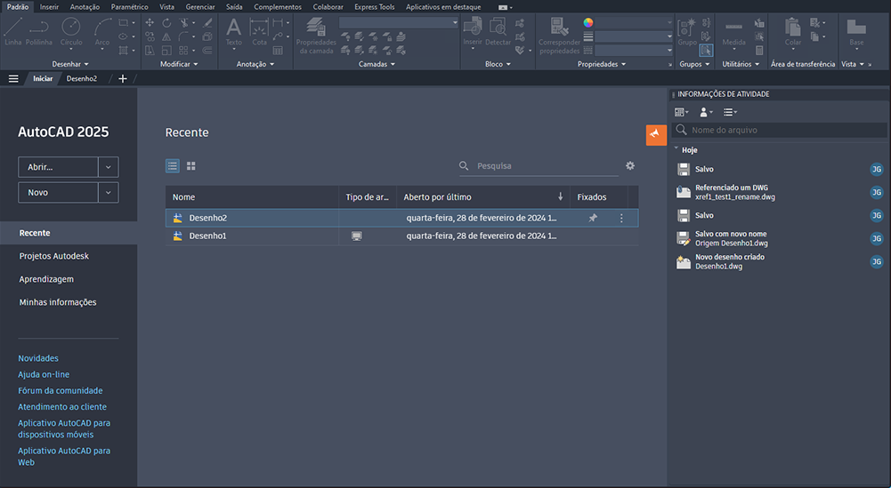 Também é possível visualizar as atividades de um desenho sem abrir o arquivo. Na guia Início, clique em Recente e selecione o desenho. Em seguida, clique nas reticências verticais e selecione Visualizar informações de atividade para ver as atividades do desenho na paleta encaixada.