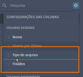 - Na vista em lista, é possível personalizar os cabeçalhos de coluna clicando em configurações. Nome e Fixado são colunas persistentes.