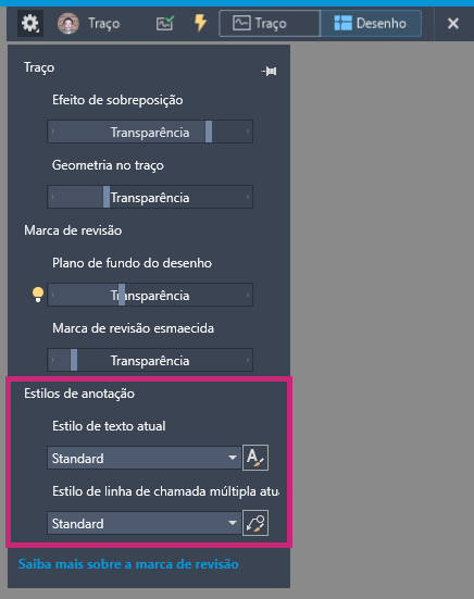 - Ao visualizar a marca de revisão importada no modo Editar desenho, os Estilos de anotação ficam disponíveis no menu suspenso Configurações, facilitando a atribuição dos estilos atuais de texto e linha de chamada múltipla ao usar o Assistente de marcas de revisão.