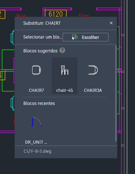 Substitua as referências de bloco especificadas selecionando em uma paleta de blocos similares sugeridos.