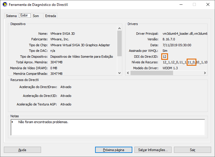 O sistema gráfico moderno requer hardware e software compatíveis com o DirectX 12. O nível mínimo do recurso do DirectX 12 é o 11_0. É possível verificar se esses requisitos são atendidos executando o comando DXDIAG no menu Iniciar do Windows. Este é um exemplo de um sistema que atende os requisitos:
