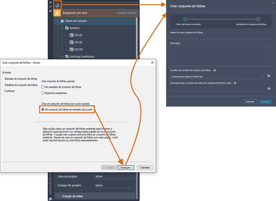 Nessa versão, o Gerenciador do conjunto de folhas para Web fornece um acesso fácil para criar um conjunto de folhas no Autodesk Docs, quer você esteja usando o AutoCAD para desktop ou o aplicativo Web do AutoCAD.