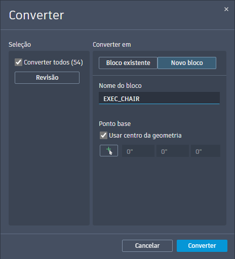 Como alternativa, é possível converter o objeto de origem ou as instâncias selecionadas em um novo bloco. Na caixa de diálogo Converter, defina um novo bloco especificando um nome de bloco e um ponto de inserção. Por padrão, o ponto de inserção é definido como o centro da geometria selecionado.