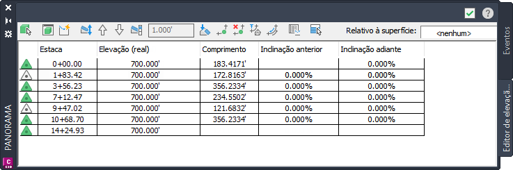 Na imagem 1, o Editor de elevação mostra as elevações para as linhas do recurso quadradas, incluindo dois pontos de divisão onde estas linhas cruzam outras linhas de recurso. No Editor de elevação, o símbolo do ponto na primeira coluna inclui um sinal de mais (+) em qualquer ponto que faça uma intersecção com outra linha do recurso.