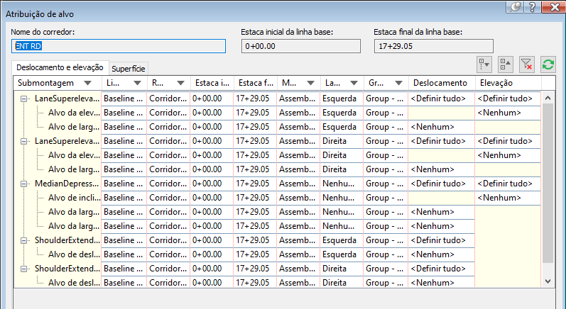 Usando a caixa de diálogo Propriedades do corredor, é possível ter como alvo as imagens de levantamento topográfico e polilinhas, assim como alinhamentos e perfis. Para acessar as propriedades de corredor, selecione um corredor, clique com o botão direito e selecione Propriedades de corredor. A caixa de diálogo Propriedades de corredor é mostrada na figura 32.