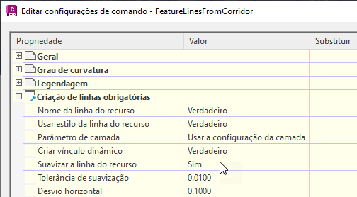 Figura 4: Configuração do comando para suavizar linhas de recurso de corredor para nivelamento