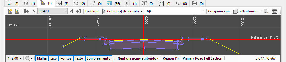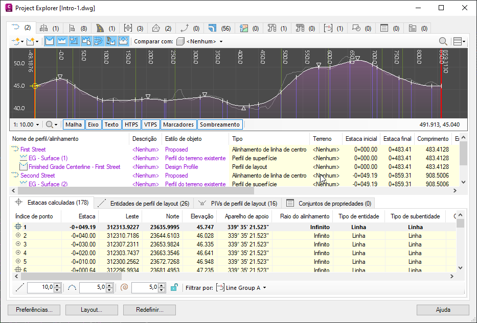 Algumas categorias de objeto incluem um Gráfico do perfil longitudinal ou gráfico de seção dinâmico na parte superior da janela. Esses gráficos permitem que o objeto selecionado seja visualizado no perfil ou na seção sem a necessidade de desenhar gráficos do perfil longitudinal ou gráficos de seção. As vistas são responsivas quando uma atualização é necessária e incluem diversas ferramentas projetadas para ajudar você a compreender melhor a estrutura subjacente do conteúdo exibido. Consulte o tópico Gráfico de perfil longitudinal e gráfico de seção para obter mais detalhes.