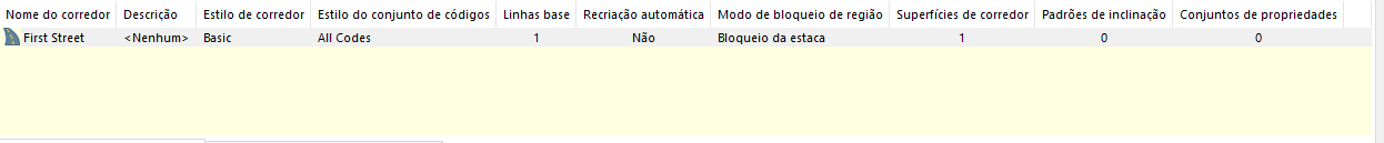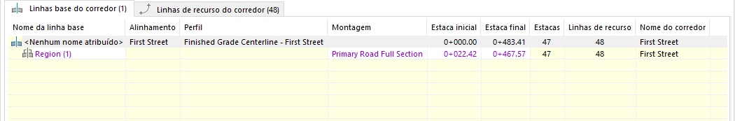 O painel de lista de subobjetos contém uma lista que é preenchida quando uma seleção de objeto é feita na interface do usuário. A natureza de cada subobjeto listado dependerá do tipo de objeto selecionado, mas pode incluir itens como pontos, segmentos de lote, linhas base de corredor e regiões, triângulos de superfície, células de superfície e entidades de alinhamento ou perfil. Novamente, os parâmetros de subobjeto que são realçados contra um plano de fundo branco são diretamente editáveis no Project Explorer clicando duas vezes no valor exibido. Os elementos de subobjeto que são exibidos em vermelho indicam a presença de uma violação de projeto de algum tipo. Passe o mouse sobre qualquer subobjeto para exibir uma dica de ferramenta que forneça mais informações sobre a natureza da violação.