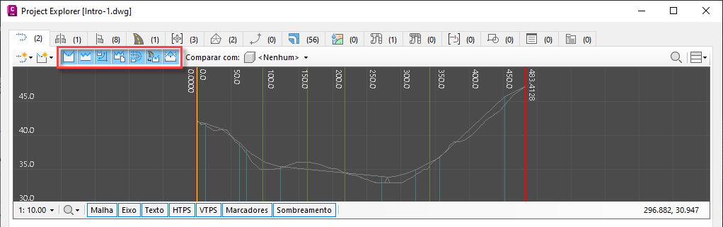 O valor de exagero vertical e as configurações de exibição/ocultação para cada componente visual de um determinado gráfico do perfil longitudinal ou gráfico de seção também podem ser controlados nos controles de vista associados na janela principal do Project Explorer, conforme indicado abaixo.