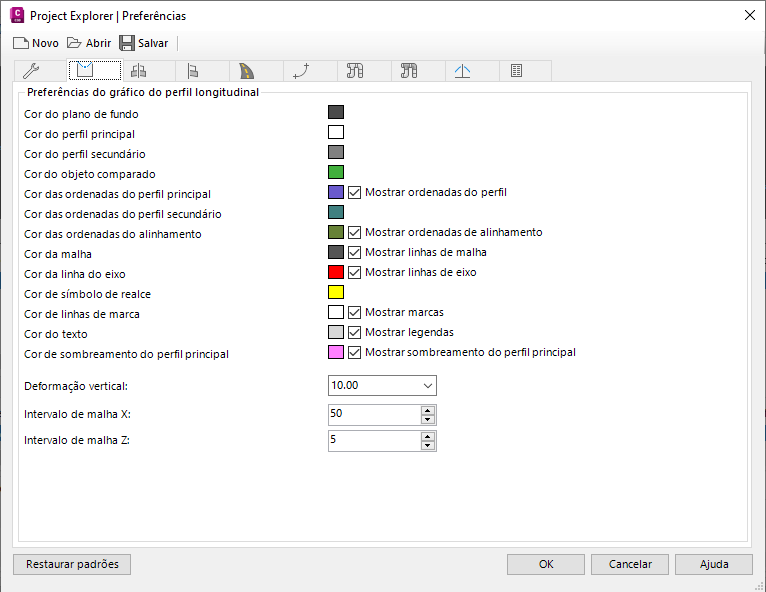 As cinco guias restantes na janela Preferências do Project Explorer controlam as configurações de cor, estilo, malha e escala dos diversos gráficos do perfil longitudinal e de seção na janela principal do Project Explorer.