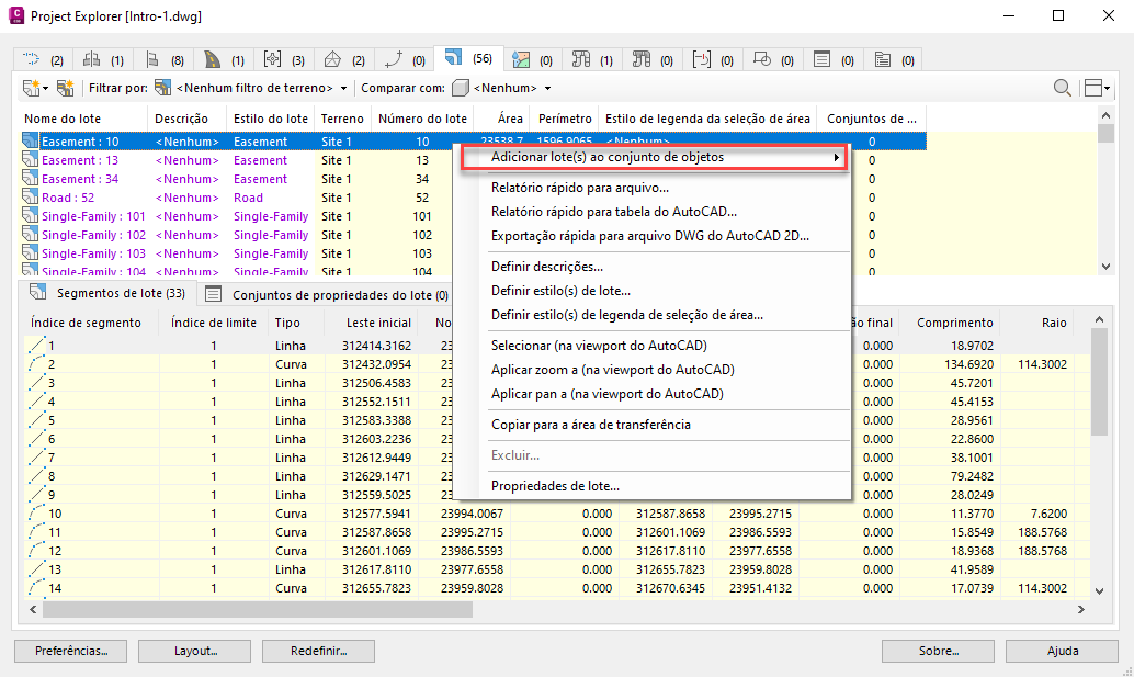 Vários relatórios podem ser gerados ou atualizados usando o recurso Conjuntos de objetos no Project Explorer.