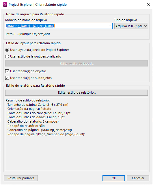 As configurações da janela Criar relatório rápido podem ser redefinidas com os valores padrão a qualquer momento clicando no botão Restaurar padrões no canto inferior esquerdo da janela.