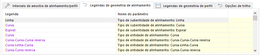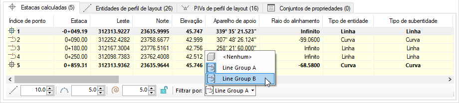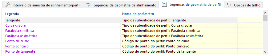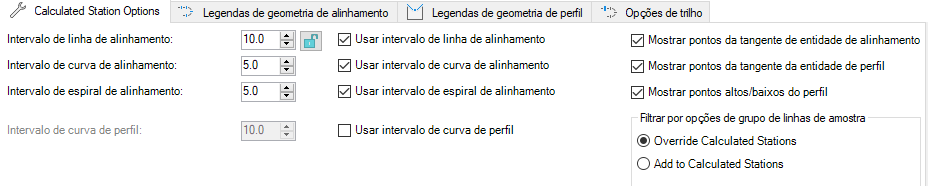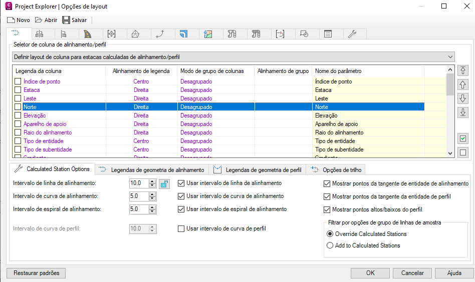 Essas configurações controlam o conteúdo da lista de subobjetos de Estacas calculadas para alinhamentos e perfis.