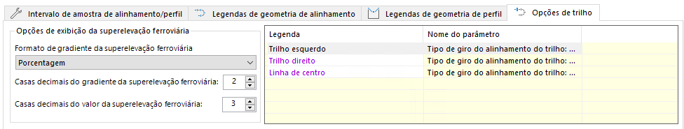 A guia Opções de trilho apresenta as Opções de exibição de superelevação ferroviária e uma lista de legendas. Use a caixa Opções de exibição de superelevação ferroviária para controlar o valor de Gradiente de superelevação ferroviária na guia Curvas de superelevação ferroviária. A lista de legendas permite editar o nome das legendas de trilhos no desenho. Depois que você editar uma legenda na caixa de diálogo Opções de trilho, as legendas da janela principal do Project Explorer, guia Alinhamentos, lista Estacas calculadas e Tipo de giro do trilho serão atualizadas.