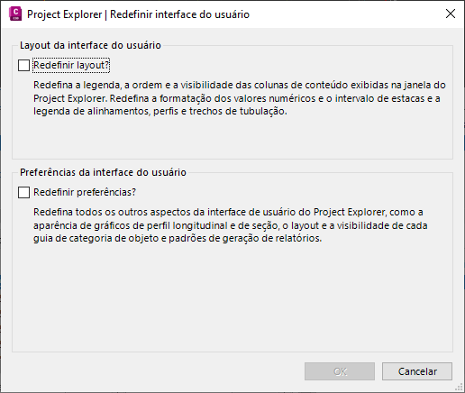 Para redefinir as preferências e/ou o layout da interface do usuário a qualquer momento, clique no botão Redefinir no canto inferior esquerdo da janela principal doProject Explorer.