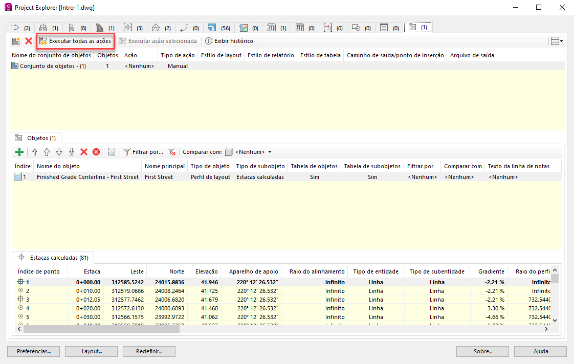 | Dinâmico | Neste caso, as ações são acionadas dinamicamente quando qualquer objeto associado é modificado nas janelas do Civil 3D ou do Project Explorer. Atualmente, esse tipo de ação é somente Ações do conjunto de objetos que geram tabelas do AutoCAD. |