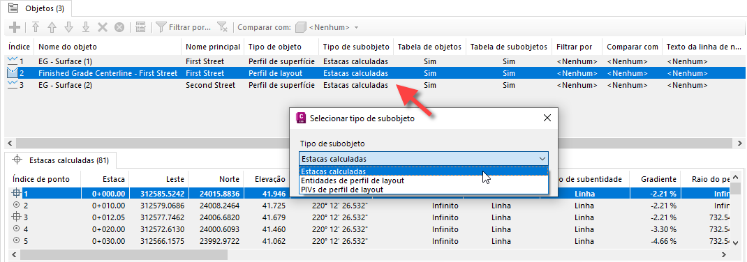 Para alguns tipos de objeto do Civil 3D, há uma variedade de tipos de subobjetos disponíveis para um item de conjunto de objetos listado. Por exemplo, para alinhamentos, é possível gerar um relatório que inclua estacas calculadas, entidades de alinhamento, PIs do alinhamento ou estacas críticas de superelevação.