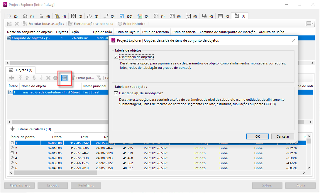 Com essas opções, é possível decidir desativar a criação da Tabela de objetos ou da Tabela de subobjetos. Isso é útil para situações em que você pode desejar (por exemplo) criar um relatório ou uma tabela que inclua uma lista de estruturas (que apareceriam em uma Tabela de subobjetos), mas não é necessário ver os detalhes da rede de tubulação (que apareceriam na Tabela de objetos).