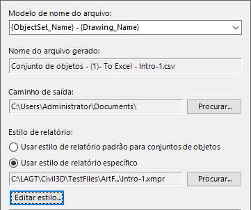 | Gerar relatório no arquivo CSV | Utilize a opção Gerar relatório no arquivo CSV para fazer com que um arquivo de relatório de saída no formato CSV seja gerado quando o botão Executar ação for clicado. O uso desta opção requer a seleção de um Estilo de layout que determina o layout e o tipo de arquivo do relatório e um caminho de saída. |