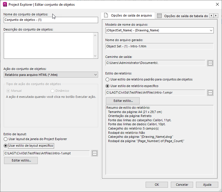 Ao utilizar a ação Gerar relatório, um Estilo de layout deve ser atribuído ao conjunto de objetos. Este estilo de layout determinará o layout e a formatação do conteúdo no relatório gerado.