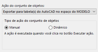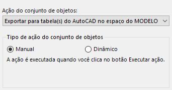 Uma ação opcional do conjunto de objetos pode ser atribuída a cada conjunto de objetos. As ações são geralmente utilizadas para automatizar o processo de geração de relatórios, planilhas ou tabelas do AutoCAD. O parâmetro Tipo de ação do conjunto de objetos determina como a ação atribuída deve ser acionada: manual ou dinamicamente.