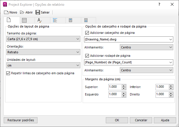 As Opções de relatório determinam o tamanho da página, a orientação da página, as margens da página, o cabeçalho do relatório, as configurações do cabeçalho da página e do rodapé da página para todos os relatórios e planilhas gerados no Project Explorer.