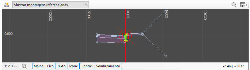 A Vista de montagem na guia Montagens exibe uma seção dinâmica em todas as submontagens associadas à montagem atualmente selecionada. Qualquer submontagem selecionada na lista de submontagens é realçada na tela da vista para facilitar a identificação. As alterações feitas a qualquer parâmetro em qualquer uma das submontagens de exibição são refletidas instantaneamente na Vista de montagem.