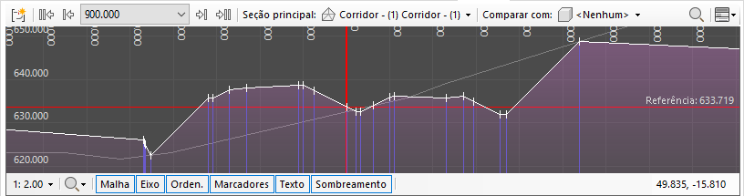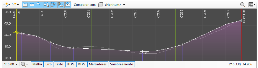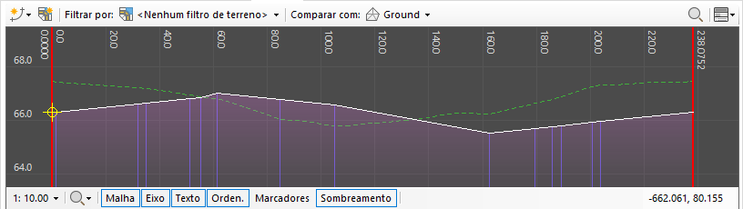 Para comparar a estaca e a elevação de pontos no perfil selecionado com outros elementos do projeto, utilize a lista suspensa de objetos adjacentes à legenda Comparar com para selecionar outro alinhamento, outro perfil ou outra superfície no desenho atual. Isso fará com que uma linha de perfil comparada seja desenhada no gráfico do perfil longitudinal indicando a relação entre o objeto comparado e o perfil exibido. Além disso, a lista de pontos das estacas calculadas para o alinhamento ou perfil selecionado exibirá os valores de elevação comparados e outros detalhes relevantes para cada ponto exibido.