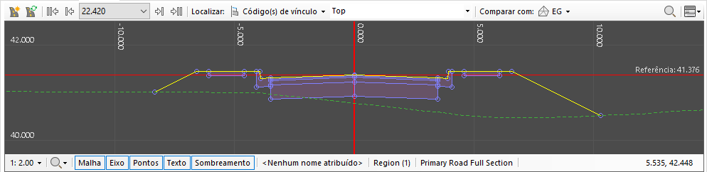 O gráfico de seção do grupo de linhas de amostra na guia Grupos de linhas de amostra exibe uma seção dinâmica no grupo de linhas de amostra selecionado em qualquer localização da linha de amostra. Utilize as setas para frente/para trás ou a lista suspensa de estacas de linha de amostra disponíveis para selecionar a estaca na qual uma seção será exibida. A lista Seção principal na barra de ferramentas pode ser utilizada para realçar códigos específicos de ponto, vínculo ou forma na Vista de corredor. Códigos podem ser selecionados em uma lista suspensa ou digitados no campo como uma lista delimitada por vírgulas, onde vários códigos precisam ser realçados.