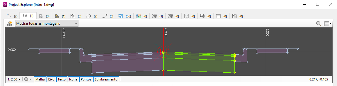 O Project Explorer apresenta uma variedade de gráficos do perfil longitudinal e de seção dinâmicos que fornecem uma visão ao vivo dos elementos em seu projeto do Civil 3D.