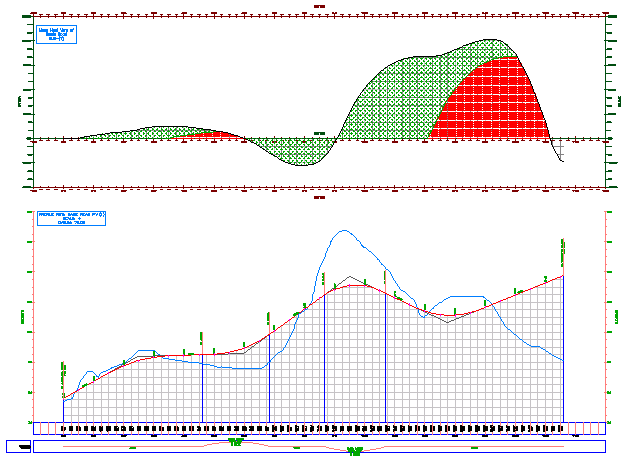 Observe que o gráfico é alterado. Pontos de equilíbrio são os pontos nos quais a linha de remoção em massa cruza a linha de equilíbrio. Estas são a estaca na qual o volume do corte do aterro são iguais.