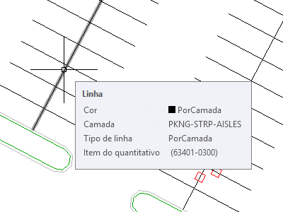 Esta ação ativa o modo seleção de objeto, em que é possível selecionar o contorno de um objeto fechado, em oposição a um ponto dentro do objeto. Como algumas das ilhas de estacionamento são subdivididas por tubulações, é possível utilizar a o modo de seleção de objeto para atribuir códigos de itens do quantitativo a todo o objeto, não apenas à área fechada que você selecionar.